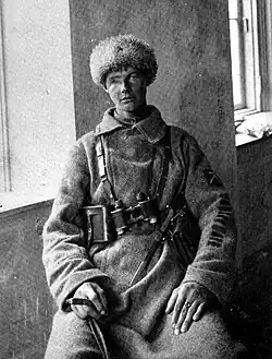 After the beginning of the Allied intervention, some foreign uniform pieces began to make their way into the Red Army as Lenin recalled during a 1920 conference: '... and to us now one after [another] approach trains with splendid English equipment, [which] frequently meet Russian Red [Army] men. Whole divisions invested in ... English [clothes] and[,] ... [as] one comrade in the Caucasus [related to me], [a] whole [Red Army] division [wearing] Italian bersale. I feel very sorry that I do not have [any photos] of these ... Red [Army] men ... . I must [admit] ... that the Red Army [is] beholden to English merchants[; merchants] that dress our men via their soldiers, which the Bolsheviks beat and will beat still many more times...'.[d][27] There was much truth behind these words as shown by British Major General Knox's outrage at the situation in Siberia during 1919: 80% of the White Army's conscripts had run off to the Red side of the front, presumably taking 200,000 British uniforms with them. Commissar Trotsky sent a letter to Knox thanking him for his donation.[28] Foreign uniforms in the Red Army predate such events however as foreigners who joined would sometimes retain their old uniforms in spite of orders to do the contrary.[29]