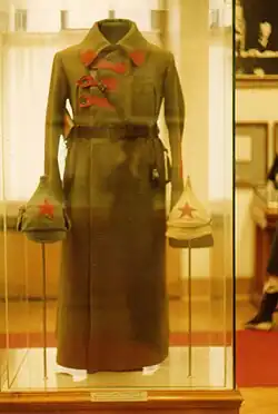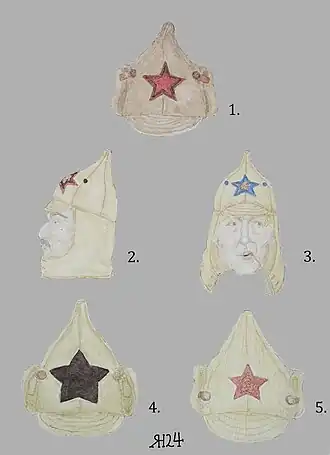 The most distinctive piece of the new M1919 uniform was the budenovka, although it only became commonly worn from 1920.[62] This woollen khaki headgear, intended for winter use, could easily be identified by the blunt cloth "spike" that protruded from the top below which was a cloth peak and a cloth flap, secured with branch colour buttons and leather straps, which could be rolled down to cover the neck, ears, and chin. On the front was worn a cloth star (4.3–8.8 cm in diameter) in branch of service colour with black lines within the star following close to its edges; black stars had red lines around the edges (both 5–6 mm in width).[65] A second pattern was introduced on 8 April 1919 with a taller point, a stiffening rod to prevent the point drooping, and a larger star (10.5 cm in diameter) with an enamel Red Army cap badge worn in its centre.[61] Men who modified their budenovkas to have taller points were jokingly nicknamed umootvod, meaning rod-brains: the taller the point the more feeble the mind.[66] A light khaki cotton version was also worn in the summer.[30]