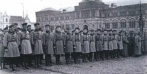 The beginnings of the Red Army and its continuation of this revolutionary symbology can be seen in the Red Guards that preceded it in 1917. These armed bands, primary composed of factory workers, were a wholly volunteer force where commanders were elected during militia meetings.[13][14] As more men returned from the front their ranks were swelled with soldiers and sailors as well as international volunteers, during the first months of 1918.[15]
