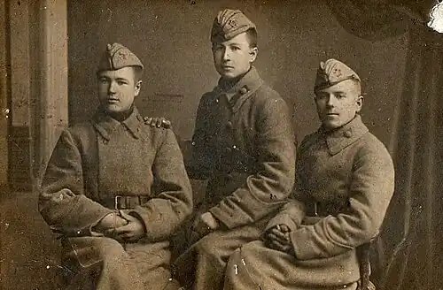Red Guard uniform, or lack thereof, was a melting pot of both military and civilian garments. Guardsmen wore whatever was available with their scant red symbols being the only thing that united them aesthetically, if even worn.[10] German and Austro-Hungarian POWs turned Red Guards would continue wearing their old uniforms due to a lack of alternatives.[16] During the civil war years, the Red Army would inherit such a situation until new uniforms could be provided.