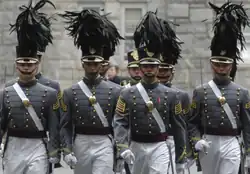 Spring parade dress consists of cadet grey swallow-tail coats with 21-gold buttons, a standing collar, white trousers, and black shakos (known as a "tarbucket hat" in U.S. Army nomenclature). Winter parade dress is similar to spring parade dress, though trousers are colored cadet gray instead of white. This same uniform is worn without the black shakos hat and with the gray or white peaked service cap depending on the season when not parading but still required for formal events. For evening formal events, no headgear is worn.[20]