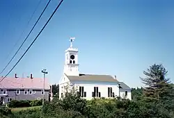 The early history of the church is shrouded in mystery; it was dedicated in January 1841, and its designer and builder are not known. The bell in the tower is original, and the clock was added in 1889. Use of the building for religious purposes had declined by the early 20th century to the point that it was deeded to the town, apparently with the stipulation that its exterior remain unaltered. It served as the community's town hall until 1987, and was further adapted for use as a gymnasium by the local schools in 1949-50. These functions were moved to a modern facility in 1987. The building has since housed the town library and archives.[3]