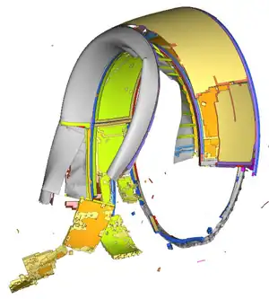 Image from failure scenario modeling by Boeing reconstructing UA1175 cowling loss based on remaining parts only, because de­parted parts were lost at sea. (NTSB photo)