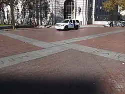 In the original design, UN Plaza features included 117,000 sq ft (10,900 m2) of brick paving, laid in a herringbone pattern, and 20,000 sq ft (1,900 m2) of grass lawn.[11] The paving in the southwest part of UN Plaza, near the border with Market Street, is interrupted by a cross formed by granite blocks inlaid with brass which indicate the coordinates of San Francisco used to measure distances to other cities.[5]: 4–67  It is built on the former site of the City Hall that was destroyed in the 1906 earthquake.[14] The pedestrian promenade along the Fulton alignment was lit with 16 light standards and featured 24 wood slat benches along the outer edges along with 192 London plane and black poplar trees. As mentioned above, the focal point was intended to be a large fountain executed in granite slabwork.[11] The design of UN Plaza is credited to the landscape architecture firm of Halprin & Associates, with Don Carter as principal-in-charge, and Angela Danadjieva (who later served as lead designer for Freeway Park in Seattle) as the landscape architect.[15][16]
