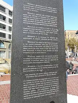 17. ^ a b Epstein, Edward (6 April 1995). "Work Begins on Memorial in U.N. Plaza". San Francisco Chronicle. Retrieved 4 October 2018.