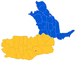 1861 map of the United Principalities Moldavia (in blue) and Wallachia (in yellow);[9] marks for the two capitals (Iași and Bucharest), and the proposed judicial capital, Focșani, located on the former border, thus in the middle.