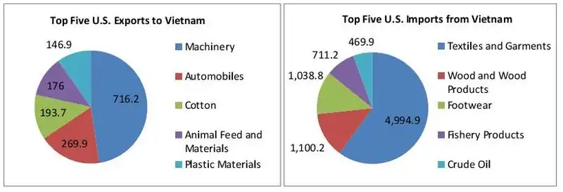 U.S. - Vietnam Trade Relations refer to the bilateral trade relationship between the United States of America (U.S.) and the Socialist Republic of Vietnam (Vietnam) from 1990s to 2012. After more than two decades of no economic relationship since the end of the Vietnam War,[1] the two governments reestablished economic relationship during the 1990s.[2] The bilateral trade between the U.S. and Vietnam grew slowly afterwards, and it has developed rapidly after the signing of the U.S.-Vietnam Bilateral Trade Agreement in December 2001.[3] Total bilateral trade turnover has increased 1200% from $1.5 billion in 2001 to over $20 billion in 2011.[4] The bilateral trade relations further developed after the U.S. granted Vietnam permanent normal trade relations (PNTR) status as part of Vietnam’s accession to the World Trade Organization (WTO) in 2007.[2] The U.S. and Vietnam also came to a Trade and Investment Framework Agreement (TIFA) in 2007.[5] Vietnam was recently the United States' 26th largest goods imports partner with $17.5 billion in 2011,[6] and was the 45th largest goods export market with $3.7 billion in 2010.[5] Vietnam with six other partners are now in the ongoing Trans-Pacific Partnership (TPP) negotiations with the U.S.[7] The growth in bilateral trade has also been accompanied by issues and problems, e.g. anti-dumping cases, worker’s rights, non-market economy, Intellectual Property Rights (IPR) protection and Vietnam’s exchange rate policy.[2]