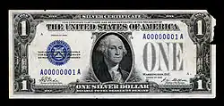In 1934, the design of the $1 silver certificate was changed. This occurred with that year's passage of the Silver Purchase Act, which led to a large increase in dollar bills backed by that metal.[22] Under Washington's portrait, ONE SILVER DOLLAR was changed to ONE DOLLAR. The Treasury seal was moved to the right and superimposed over ONE, and a blue numeral 1 was added to the left. The reverse remained the same.