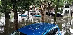 Flooding, either from weather events, rising sea levels or infrastructure failures are a major cause of death, disease and economic losses throughout the world. Climate change and rapidly expanding urban settlements are two factors that increase occurrence and severity of urban flooding, especially in the developing world.[49][50][51] Storm surges can affect coastal cities and are caused by low pressure weather systems, like cyclones and hurricanes.[52] Flash floods and river floods can affect any city within a floodplain or with inadequate drainage infrastructure. These can be caused by large quantities of rain or heavy rapid snow melt. With all forms of flooding, cities are more vulnerable because of the large quantity of paved and concrete surfaces; these impermeable surfaces cause massive amounts of runoff that can quickly overwhelm the limited infrastructure of storm drains, flood canals and intentional floodplains. Many cities in the developing world simply have no infrastructure whatsoever to redirect floodwaters.[53] Around the world, floods kill thousands of people every year and are responsible for billions of dollars in damages and economic losses.[54] In cities with poor or absent drainage infrastructure, flooding can also lead to the contamination of drinking water sources (aquifers, wells, inland waterways) with salt water, chemical pollution, and most frequently, viral and bacterial contaminants.[55] Flooding, much like heat waves and droughts, can also wreak havoc on agricultural areas, quickly destroying large amounts of crops.