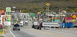 Clustered commercial strips like this one in Breezewood, Pennsylvania are common in outer rural exurbs and suburbs in metropolitan areas.[53]