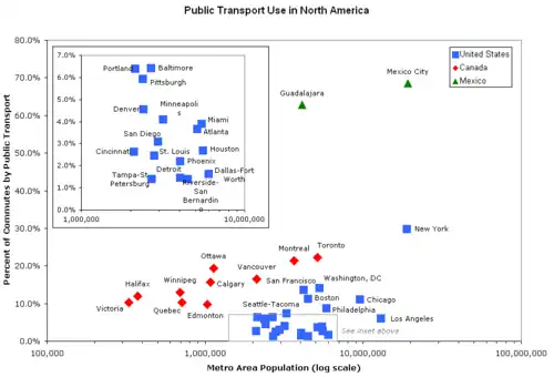 Residents of low-density areas spend a higher proportion of their income on transportation than residents of high density areas.[89] The unplanned nature of outward urban development is commonly linked to increased dependency on cars. In 2003, a British newspaper calculated that urban sprawl would cause an economic loss of £3,905 per year, per person through cars alone, based on data from the RAC estimating that the average cost of operating a car in the UK at that time was £5,000 a year, while train travel (assuming a citizen commutes every day of the year, with a ticket cost of 3 pounds) would be only £1,095.[90] Additionally, increased density increases the supply of housing in desirable areas, and thus, it also decreases housing prices in those areas (by the logic of supply and demand).[91][92][93]