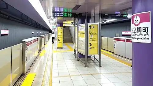 Ushigome-yanagichō Station (牛込柳町駅, Ushigome-yanagichō-eki) is a subway station on the Toei Oedo Line in Shinjuku, Tokyo, Japan, operated by the Tokyo subway operator Tokyo Metropolitan Bureau of Transportation (Toei). It is numbered "E-04".