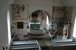 Despite its reconstruction in the 19th century, the church still retains several medieval murals. The vaults in the chancel date from the second half of the 15th century, and depict the Last Judgment, and a row of apostles. The wall separating the nave from the chancel also has partially preserved murals, older than those in the chancel and dating from the first half of the 15th century. They depict several scenes from the life of Christ, including the Last Supper and the Annunciation. Lastly there is also a set of murals decorating the vaults of the tower. These are from the 1520s and are more anecdotal, showing fables with religious overtones, including a scene of two foxed preaching for a flock of geese, an allegorical criticism of Lutheranism, which was gathering support at the time.[1]