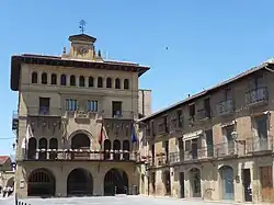 Chronologically the first major project was headquarters of the insurance company La Vasco Navarra (1924).[43] Along few large residential villas[44] the same year Eusa produced the plan of the Hijas de María Immaculada monastery.[45] Puente de San Jorge in Alcoy turned out to be the only bridge he designed (1926).[46] Casa de Misericordia was the first monumental, multi-volume establishment, designed with no restraints related to size. It included a number of in-built facilities, like a large chapel (1927).[47] Residential villa for Eguinoa brothers demonstrated ingenuity embodied in mid-size construction (1928).[48] Eusa returned to religious theme with the church of Padres Paúles, known as La Milagrosa (1928).[49] Colegio de los PP. Escolapios, a 3-storey enormous multi-wing building, was Eusa's most ambitious project so far and is one of his most iconic works (1928).[50] Basilica of Nuestra Señora del Puy in Estella turned an essay in geometry (1929),[51] while residential multi-dwellings at Plaza Príncipe de Viana marked his urbanistic capacity (1930).[52] A 7-storey edifice hosting Casino Eslava, with meticulously designed interior, was Eusa's last major work of the monarchy (1931).[53]