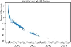 - ^ a b Kato, Taichi; Ishioka, Ryoko; Uemura, Makoto; Starkey, Donn R.; Krajci, Tom (March 2004). "V1494 Aql: Eclipsing Fast Nova with an Unusual Orbital Light Curve". Publications of the Astronomical Society of Japan. 56: S125 – S131. arXiv:astro-ph/0310519. Bibcode:2004PASJ...56S.125K. doi:10.1093/pasj/56.sp1.S125. S2CID 8328265.