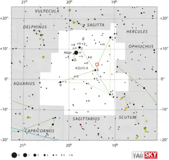 V1494 Aquilae or Nova Aquilae 1999 b was a nova which occurred during 1999 in the constellation Aquila and reached a brightness of magnitude 3.9 on 2 December 1999.[2] making it easily visible to the naked eye.[9] The nova was discovered with 14×100 binoculars by Alfredo Pereira of Cabo da Roca, Portugal at 18:50 UT on 1 December 1999, when it had a visual magnitude of 6.0.[10]