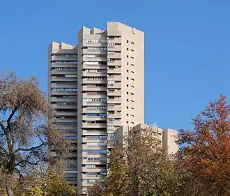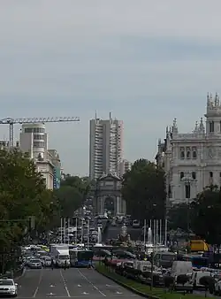 The project approval was passed by the City Council of Madrid in 1968.[2] The building process took place between 1970 and 1973.[3] The construction was temporarily halted by the City Council in April 1971 on behalf of the Ministry of Housing, on the basis of the complaints filed by the neighbours, who wanted the building to be tore down.[4] The building was then acrimoniously derided in the pages of ABC.[4] The works resumed in June.[4] A 26-floor concrete tower, reaching a 94-metre height, it became the highest residential building in the Spanish capital when it was finally opened in 1973.[4] It is located in the Retiro District, in front of the Retiro Park, in the junction of Menéndez Pelayo Avenue and O'Donnell Street.[3]