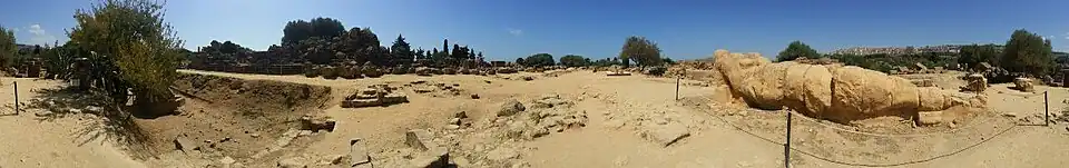 The Olympeion complex' main attraction is the huge Temple of Olympian Zeus, which was described with enthusiastic words by Diodorus Siculus and mentioned by Polybius.[5] Today it is reduced to ruins due to destruction begun in antiquity and continued through the 18th century, when the temple was used as a quarry for the port of Porto Empedocle.