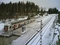 Vantaankoski railway station (Finnish: Vantaankosken rautatieasema, Swedish: Vandaforsens järnvägsstation) is a Helsinki commuter rail station located in Vantaa, Finland. It is approximately 15 kilometres (9.3 mi) north of the Helsinki Central railway station.