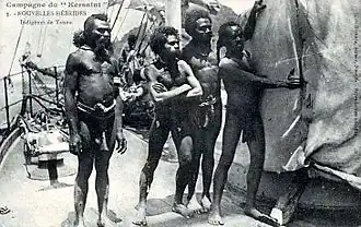 During the 1860s, planters in Australia, Fiji, New Caledonia, and the Samoan islands, in need of labourers, encouraged a long-term indentured labour trade called "blackbirding".[34] At the height of the labour trade, more than one-half the adult male population of several of the islands worked abroad. Because of this, and the poor conditions and abuse often faced by workers, as well the introduction of common diseases to which native Ni-Vanuatu had no immunity, the population of Vanuatu declined severely, with the current population being greatly reduced compared to pre-contact times.[35][12][34] Greater oversight of the trade saw it gradually wind down, with Australia barring any further 'blackbird' labourers in 1906, followed by Fiji and Samoa in 1910 and 1913 respectively.[34]