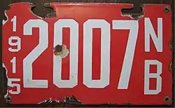 1915 | White serial on red porcelain plate; vertical "1915" and "NB" at left and right respectively | none | 1234 | 701 to approximately 2600 | |