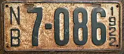 1922 | Embossed dark green serial on white plate with border line; vertical "NB" and "1922" at left and right respectively | none | 12-345 | 1-000 to approximately 13-600 | First embossed plate. |