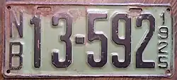 1925 | Embossed black serial on light green plate with border line; vertical "NB" and "1925" at left and right respectively | none | 12-345 | 1-000 to approximately 19-400 | |