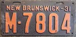 1931 | Embossed orange serial on dark purple plate; "NEW BRUNSWICK-31" at top | none | A-1234 | Probably coded by region | |