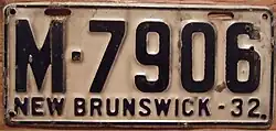 1932 | Embossed black serial on white plate with border line; "NEW BRUNSWICK-32" at bottom | none | A-1234 | Coded by region (A) | |
