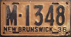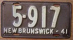 1941 | Embossed beige serial on brown plate; "NEW BRUNSWICK - 41" at bottom | none | 12-345 | 2-000 to approximately 36-500 | |