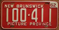 1962–63 | Embossed white serial on red plate with border line; "NEW BRUNSWICK" at top, offset to left; embossed white box at top right containing debossed "62" | "PICTURE PROVINCE" centred at bottom | 123-456 | 1-000 to approximately 152-000 | |