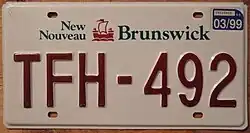 1991-2003 | Embossed red serial on reflective white plate; screened provincial wordmark (red galley graphic with "New" and "Nouveau" to the left and "Brunswick" to the right, all in green) centred at top | none | TAB 123 | ||