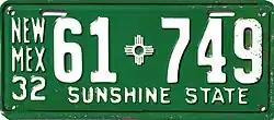 1932 Embossed white serial with Zia sun symbol separator on green plate; "NEW MEX 32" at left "SUNSHINE STATE" at bottom, offset to right 12-345 1 to approximately 65-000