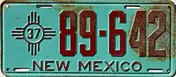 1937 Embossed maroon serial on turquoise plate; embossed Zia sun symbol at left with "37" in the center; "NEW MEXICO" centered at bottom none 12-345 1 to approximately 91-000