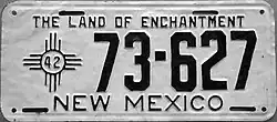 1942–43 Embossed black serial on white plate; embossed Zia sun symbol at left with "42" in the center; "NEW MEXICO" centered at bottom "THE LAND OF ENCHANTMENT" at top 12-345