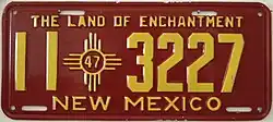 1947 Embossed yellow serial on maroon plate; embossed Zia sun symbol used as separator with "47" in the center; "NEW MEXICO" centered at bottom "THE LAND OF ENCHANTMENT" at top 1-12345