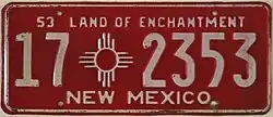 1953 Embossed white serial with Zia sun symbol separator on red plate with border line; "NEW MEXICO" centered at bottom; "53" at top left "LAND OF ENCHANTMENT" at top, offset to right 1-12345