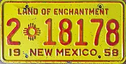 1958 Embossed red serial with Zia sun symbol separator on golden yellow plate with border line; "NEW MEXICO" centered at bottom; "58" at bottom right "LAND OF ENCHANTMENT" at top 1-12345