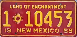1959–60 Embossed golden yellow serial with Zia sun symbol separator on maroon plate with border line; "NEW MEXICO" centered at bottom; "59" at bottom right "LAND OF ENCHANTMENT" at top 1-12345