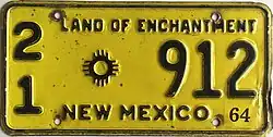 1964–65 Embossed black serial with Zia sun symbol separator on reflective yellow plate with border line; "NEW MEXICO" at bottom "LAND OF ENCHANTMENT" at top 1-12345