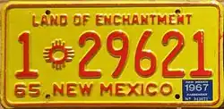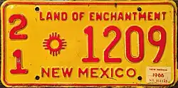 1965–69 Embossed red serial with Zia sun symbol separator on yellow plate with border line; "NEW MEXICO" centered at bottom "LAND OF ENCHANTMENT" at top 1-12345