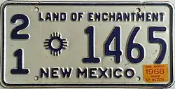 1966–70 Embossed navy blue serial with Zia sun symbol separator on reflective white plate with border line; "NEW MEXICO" at bottom "LAND OF ENCHANTMENT" at top 1-12345