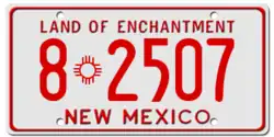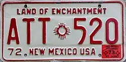 1972–74 Embossed red serial with Zia sun symbol separator on white steel plate with border line; "NEW MEXICO USA" centered at bottom; "72" at bottom left "LAND OF ENCHANTMENT" centered at top ABC-123 AAA-001 to BCT-999 Letters I, O, Q, U and V not used in serials from 1973 onwards.[2]