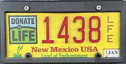 Organ Donation Awareness As yucca passenger plate, but with "Donate Life" logo at left "Land of Enchantment" as on yucca passenger plate, plus "Organ Donors Save Lives" screened in red centered at top 1234L/F/E 0001L/F/E to ?