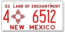 1952 Embossed red serial with Zia sun symbol separator on white plate; "NEW MEXICO" centered at bottom; "52" at top left "LAND OF ENCHANTMENT" at top, offset to right 1-12345