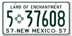 1957 Embossed green serial with Zia sun symbol separator on white plate with border line; "57 NEW MEXICO 57" at bottom "LAND OF ENCHANTMENT" centered at top 1-12345