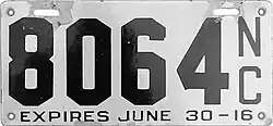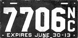 1913 White serial on black porcelain plate; vertical "NC" at right and "EXPIRES JUNE 30-13" at bottom none 1234 6801 to approximately 8000 Issued only to new registrants from April 1 through June 30, 1913, with serials following on from those on pre-state-issued plates.[3]