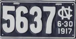 1916–17 Embossed white serial on dark blue plate with border line; "NC" monogram and "6-30 1917" at right none 12345 1 to approximately 40000 First embossed plate. From the collection of Richard Watson.