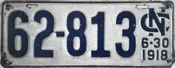 1917–18 Embossed dark blue serial on white plate with border line; "NC" monogram and "6-30 1918" at right none 12-345 1 to approximately 65-000