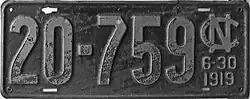 1918–19 Embossed white serial on black plate; "NC" monogram and "6-30 1919" at right none 12-345 1 to approximately 80-000